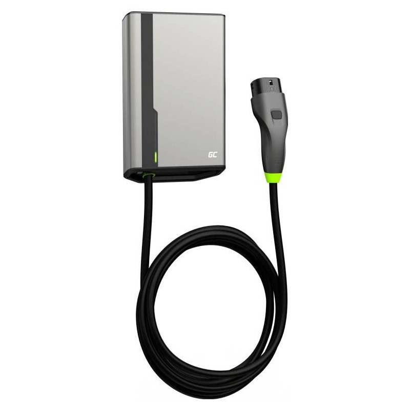 The Green Cell HabuDen Wallbox is a wall-mounted electric vehicle charger with a maximum power of 22 kW and a 7.5 m cable. It features adjustable power settings and is designed for safe use, with IP54 protection against dust and water.