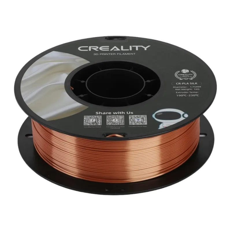 Creality CR-Silk PLA filament in copper color for 3D printing has a diameter of 1.75 mm and weighs 1 kg. It operates at extruder temperatures from 190°C to 230°C and print speeds of 40-100 mm/s, ensuring durability and a smooth surface for a variety of models.