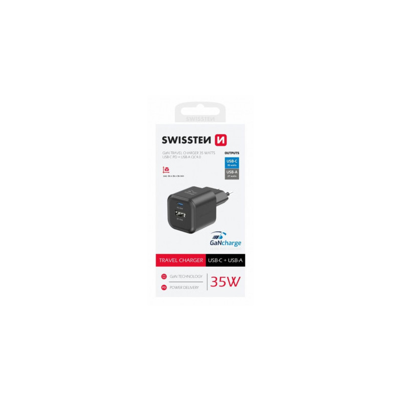 Swissten GaN Travel 35W USB-C PD + USB-A QC4.0 Black