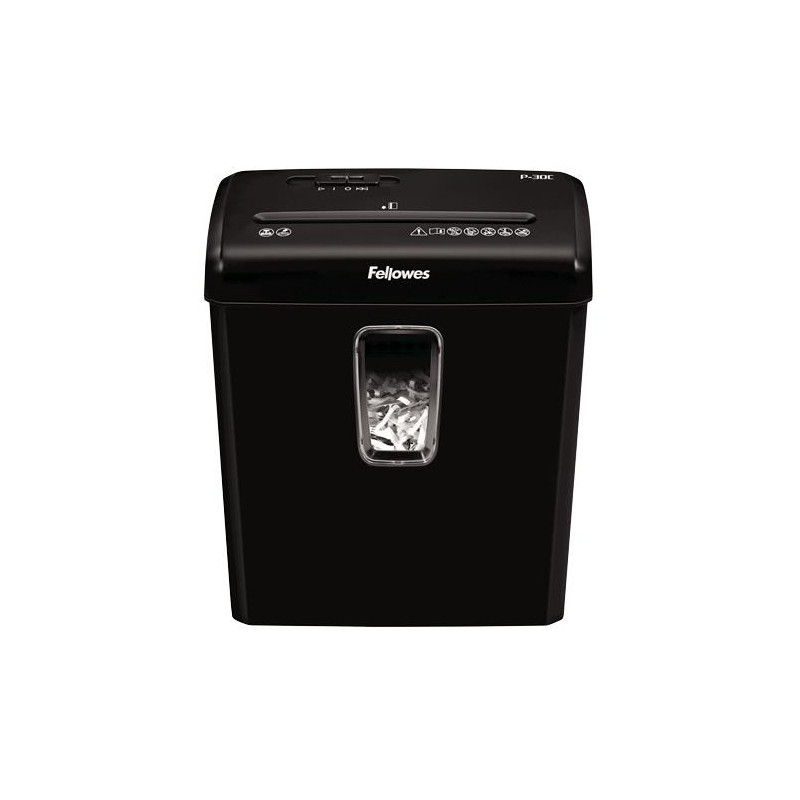 Shreds 6 sheets per pass (70gsm) into 4x34mm cross-cut particles (Security Level P-4) Up to 3 minutes non stop shredding. Suitable for occasional use in the home 15 litre waste bin Also shreds staples, credit cards and paper clips Summary Fellowes Powershred P-30C. Shredding type:...
