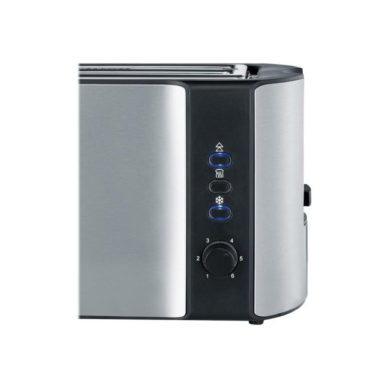 High-quality stainless steel body with thermal insulation. This toaster has a bread centering function for even toasting, a warming mode, a defrost setting, and a removable crumb tray for easy cleaning.