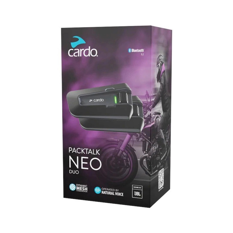 The Cardo Packtalk Neo Duo is a motorcycle intercom system that allows riders to communicate up to 1600 meters away. It features Bluetooth 5.2 connectivity, water resistance, and up to 13 hours of talk time on a single charge.