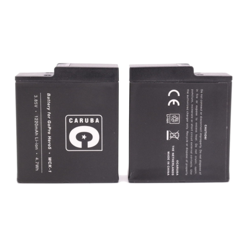 The Caruba Wall Charger and Battery Pack includes two 1220mAh batteries and a dual battery charger compatible with the GoPro Hero 5, Hero 6, and Hero 7 Black. The charger features an LCD display and a micro USB port for flexible charging.