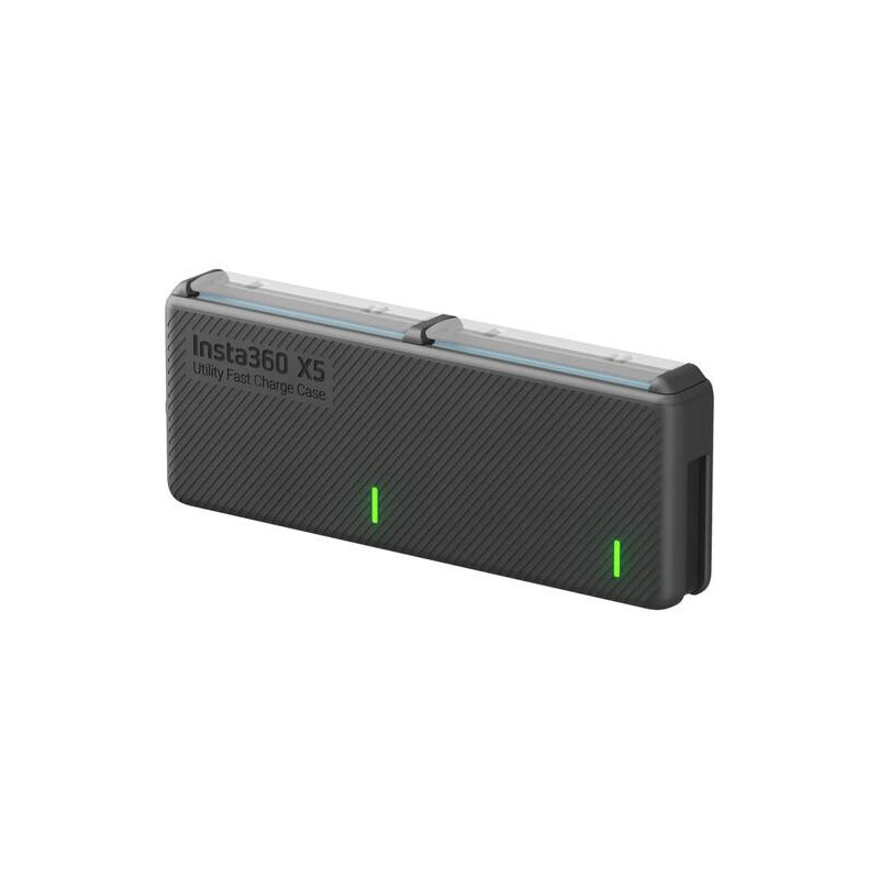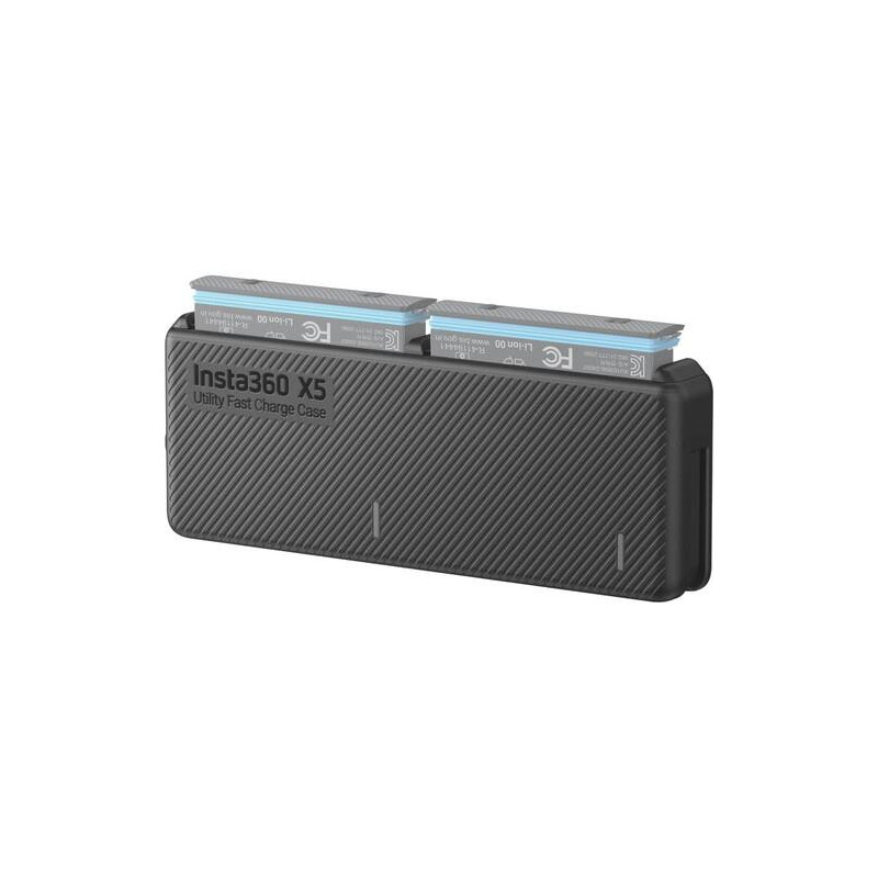 The Utility Fast-Charge Case from Insta360 provides on-location charging for two X5 batteries using a built-in USB-C cable and a separately available power source such as an AC adapter or power bank. It can fast-charge a single battery to 80% in only 28 minutes or simultaneously charge two batteries.