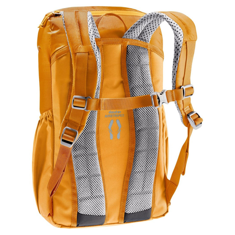 The Deuter Junior children's hiking backpack has a capacity of 18 liters and is suitable for children between 130 cm and 168 cm tall. Made of 210D polyamide, it weighs only 400 grams and features a monochrome design in amber and gray.