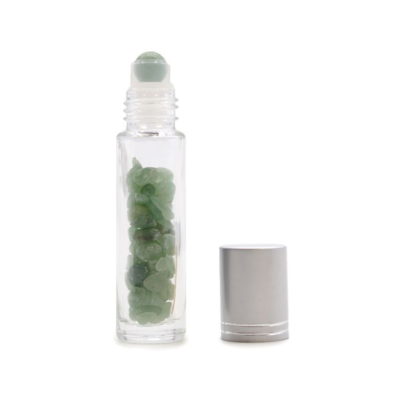 Crystal bottle with a silver-colored cap containing various natural gemstones, including aventurine. The compact size, approximately 12 x 3 x 3 cm, makes it easy to carry.