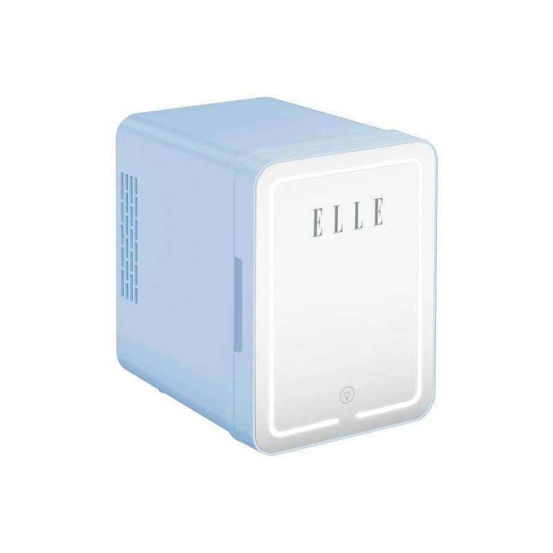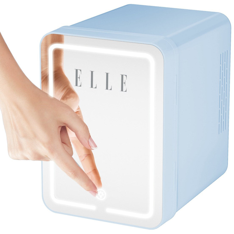The ELLE 4L mini fridge has a capacity of 4 liters and can cool items to 18 degrees below ambient temperature. It features an integrated LED makeup mirror, heating function and interior lighting for convenience.
