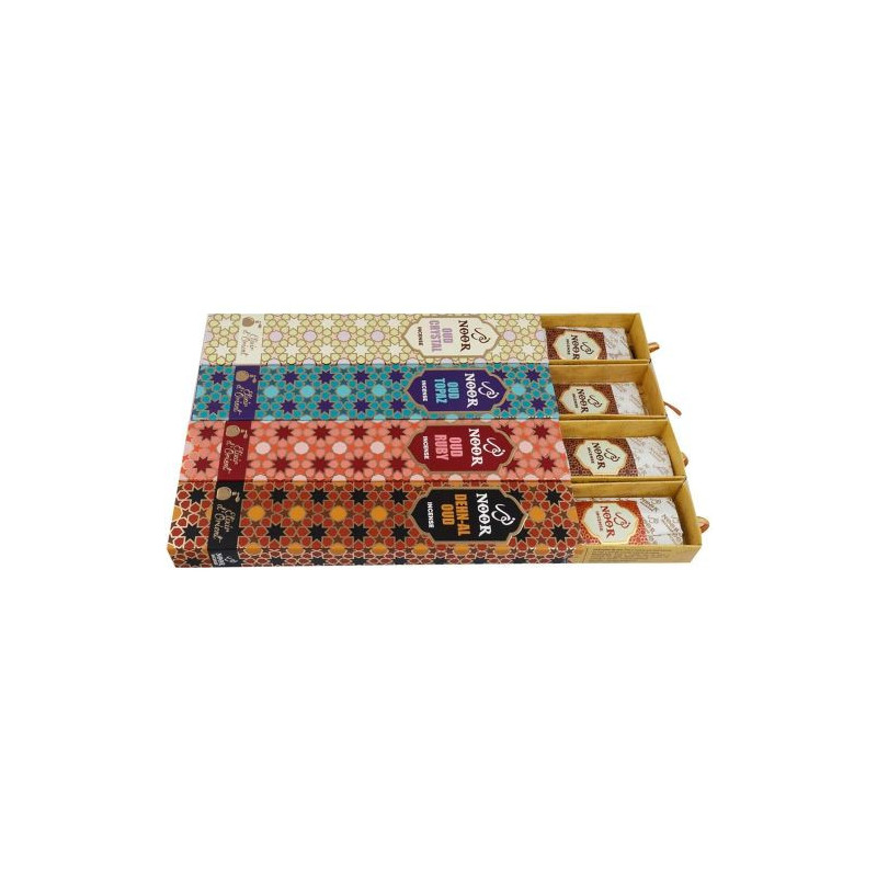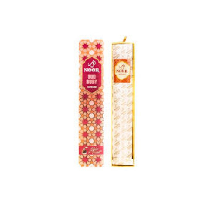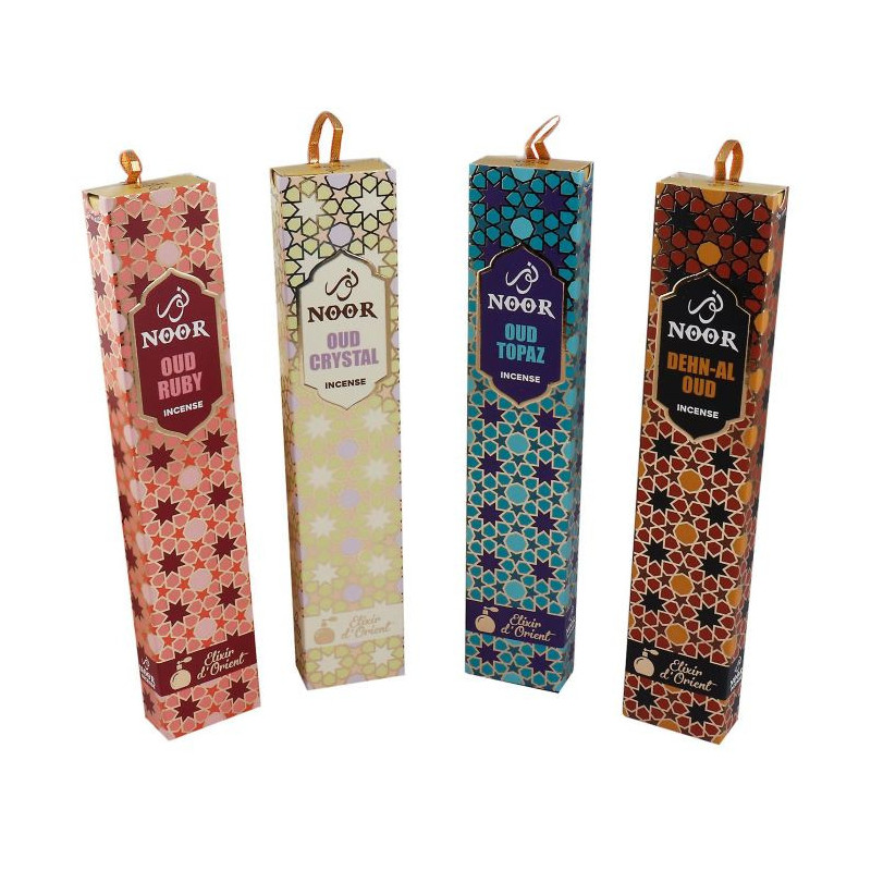 Premium Noor Oud incense weighing 15 g has a dramatic, velvety aroma. The dimensions are 4 x 21.5 x 2.3 cm and the total weight is 33 g, made in India.