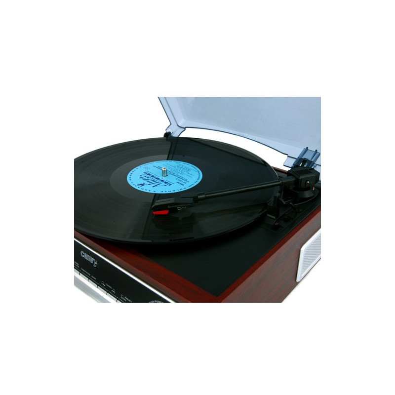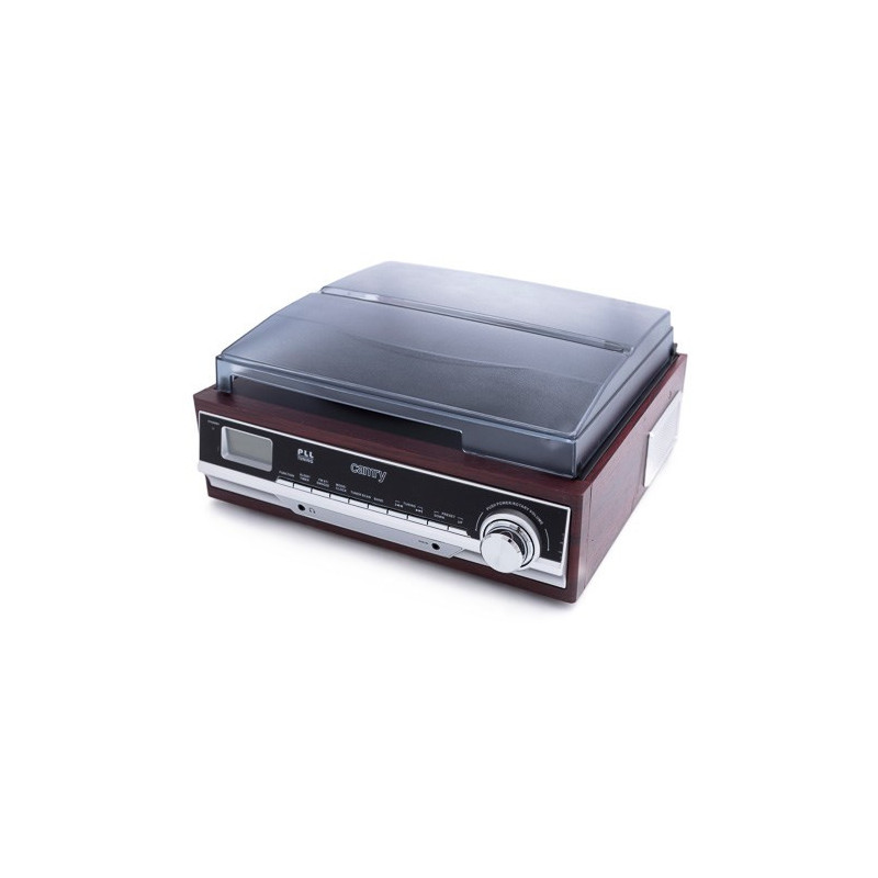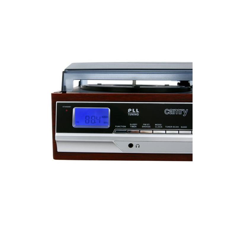 The Camry Premium CR1113 is a semi-automatic belt-drive record player that supports 78 RPM, 45 and 33 RPM speeds. It has a built-in FM/AM radio, two speakers with 3W RMS power and an LCD display.