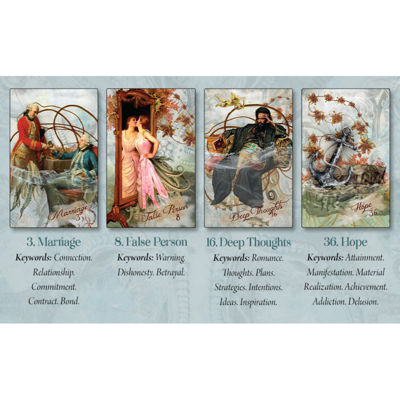 This clairvoyance set consists of two clairvoyants: 'Kipper' and 'Lenormand'. Used together, they provide the highest and most complete possible level of interpretation. Unlike tarot and oracle decks, which are read intuitively, Lenormand cards are read metaphorically, while Kipper cards are read literally. Lenormand speaks of the external world, while Kipper speaks of the interpersonal. The most common way to read Lenormand and Kipper cards is to consider the meanings of the cards as words and read them in order. You can follow a certain intuition, but the meanings of the cards are set. The Kipper deck is not a deck of cards that can solve larger societal problems. It is more personal, focused on the everyday realities of people's lives and reflects both the highest and lowest possibilities that can be in that life. It depicts people, societal roles, and personal states.