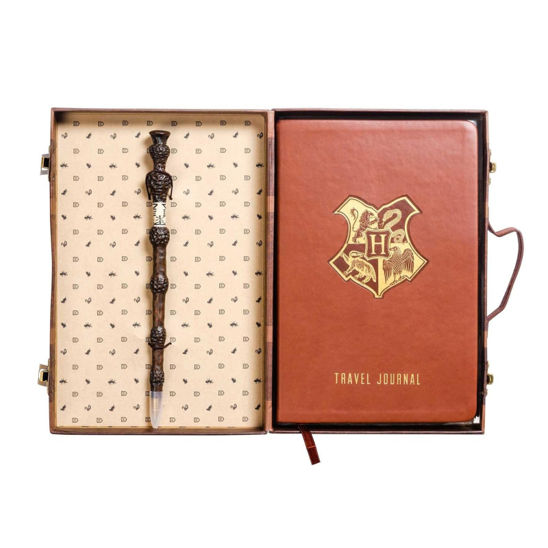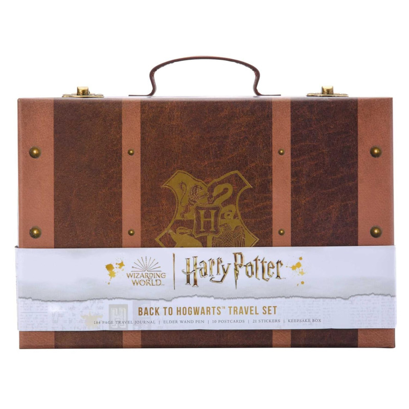 This luxurious travel stationery set includes a collectible Hogwarts™-inspired luggage case; a travel journal to capture your experiences and memories; an Elder Wand pen to write down your adventures; 10 Hogwarts™-inspired postcards to keep in touch with friends and family while you travel; and a sticker sheet to personalize your luggage case, journal, or postcards.