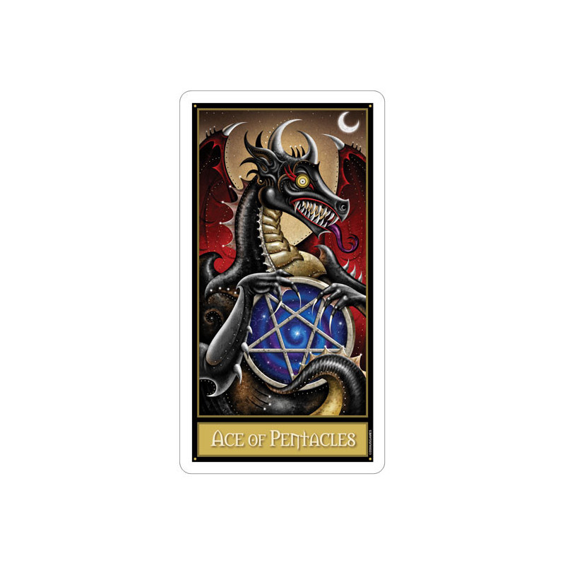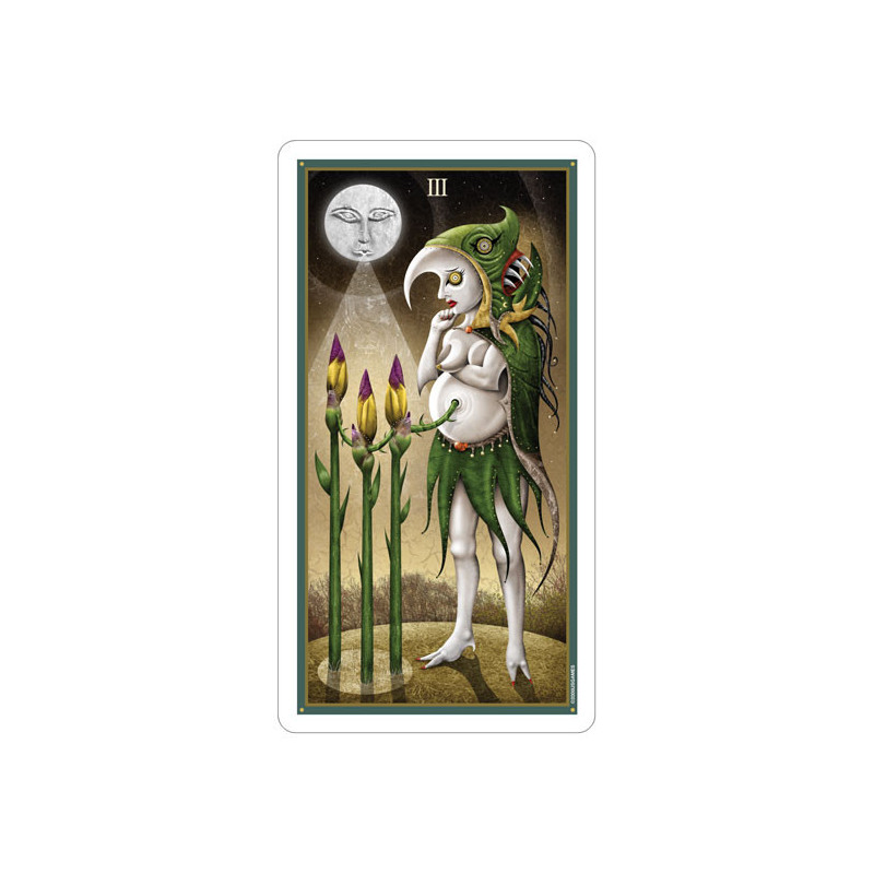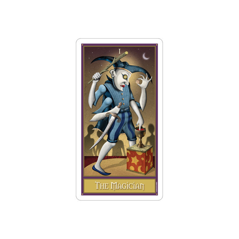 Talented artist Patrick Valenza presents a unique and distinctive interpretation of traditional tarot cards, with symbolism inspired by childhood dreams. The stylized moon-faced characters are created from photo manipulations of 18th century tombstones. The card landscapes feature surreal scenes with distant smoke screens, madhouses, and abandoned buildings.