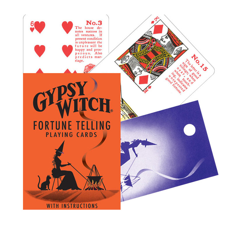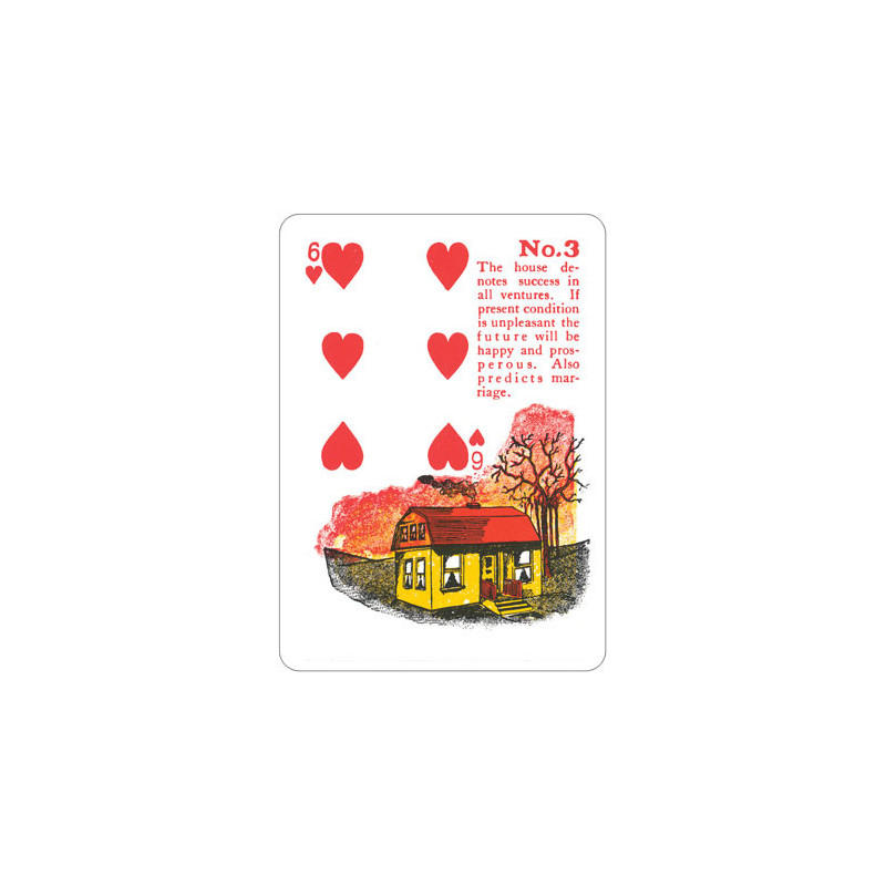 The Gypsy Witch Burim cards provide an easy-to-learn method of fortune telling. Each card in the deck is numbered and has an illustration that shows the symbolic meaning of the card. The individual card meanings are also written on the front of the cards. These cards are also suitable for regular card games because they have the standard card symbols in the upper left corner.
