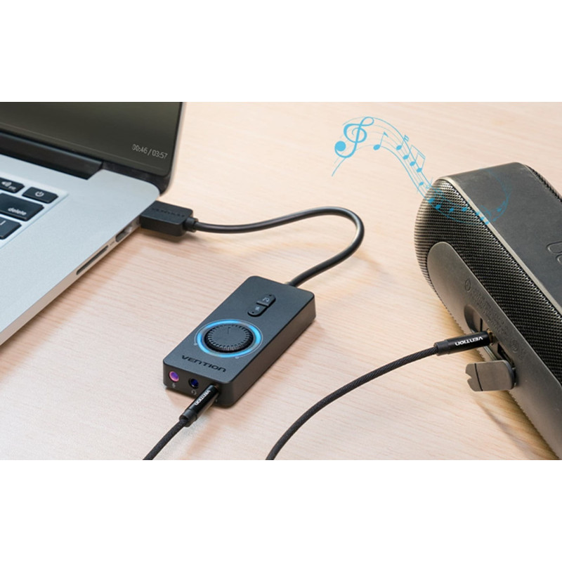 The Vention 1m USB 2.0 external sound card connects via USB and provides line-level input and output. It supports a frequency range of 44100 - 48000 Hz with 16-bit sound quality.