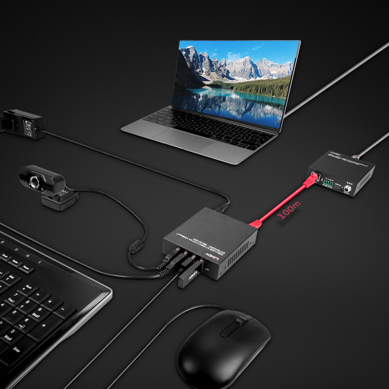 The USB 3.2 Gen 1 extender supports 5Gbps bandwidth over a maximum distance of 100m using Cat.6A cable. It features features such as power over the cable, RS232 control, and multiple USB Type A outputs.