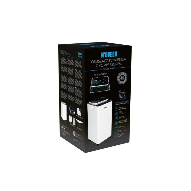 The N'OVEEN DH5000 X-LINE compressor air dryer operates at a noise level of 50 dB and has a dehumidification capacity of 10 l/24h. The device has a 2.5 L water tank, an integrated display and wheels for easy movement.
