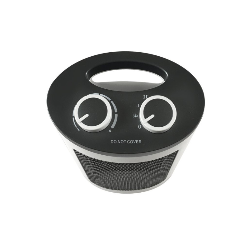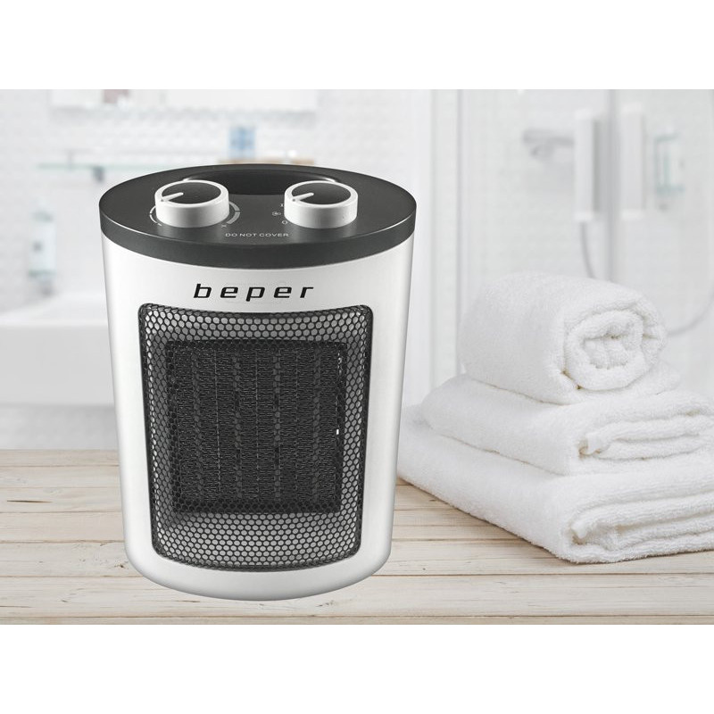 Fan heater with ceramic heating elements, for quicker and more even distribution of heat. Equipped with adjustable thermostat and 2 power settings. Cold fan function and integrated handle for easy transport. Auto shut off system in case of accidental fall, and overheating protection.