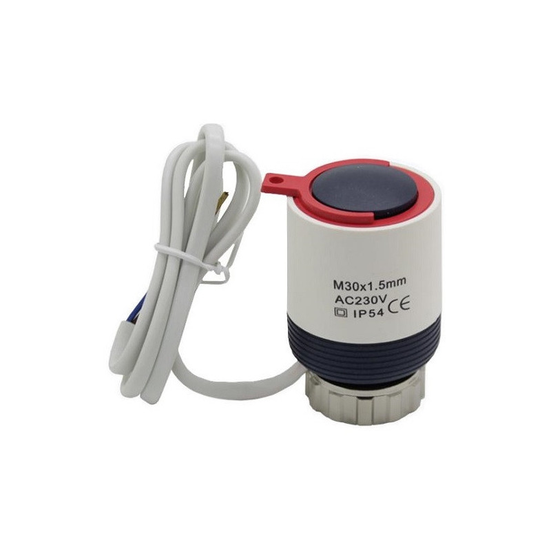 The electric thermal actuator is designed to control the heat distribution system of heating equipment. It receives commands from automation devices (such as room thermostats or controllers) and regulates the distribution of water flow according to the set parameters. With the help of the thermal actuator, it is possible to precisely control the temperature of the premises and energy consumption. The state of the thermal actuator is NC (normally closed). It is not suitable for use in a system heated by a solid fuel boiler.