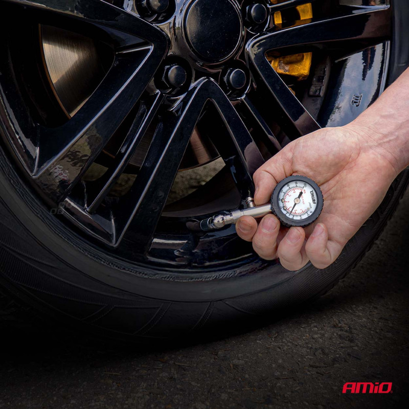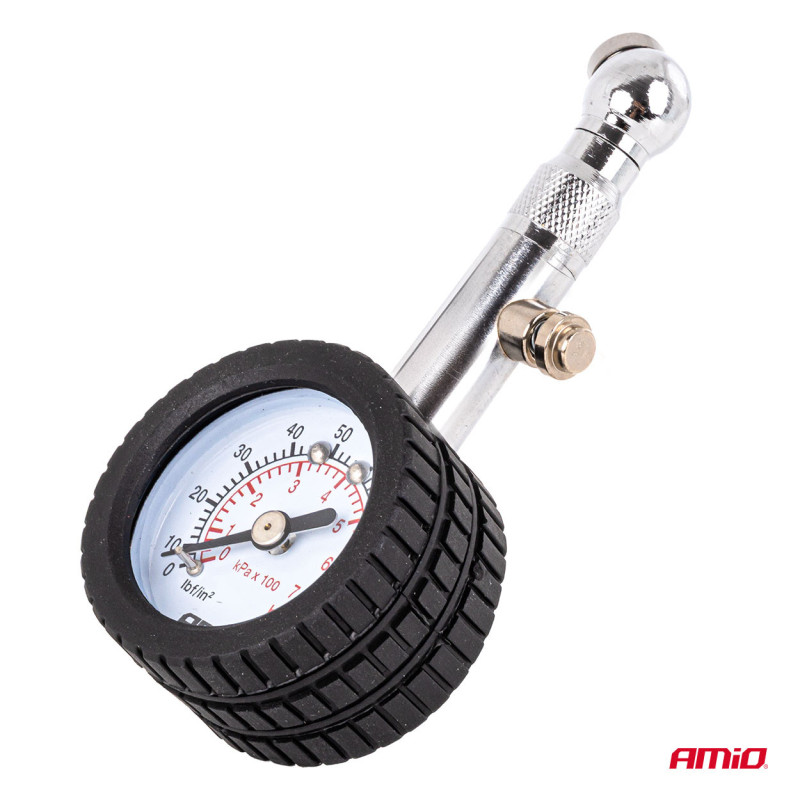 This mechanical tire pressure gauge with a rotating head and reset valve is a compact and functional tool for checking tire pressure. A measurement range of up to 7 bar enables precise measurements in passenger cars and light commercial vehicles. The rotating head facilitates access to valves in difficult-to-set positions, and the release valve allows for quick pressure reduction without removing the gauge. The analog scale ensures reliability and eliminates the need for a power supply.