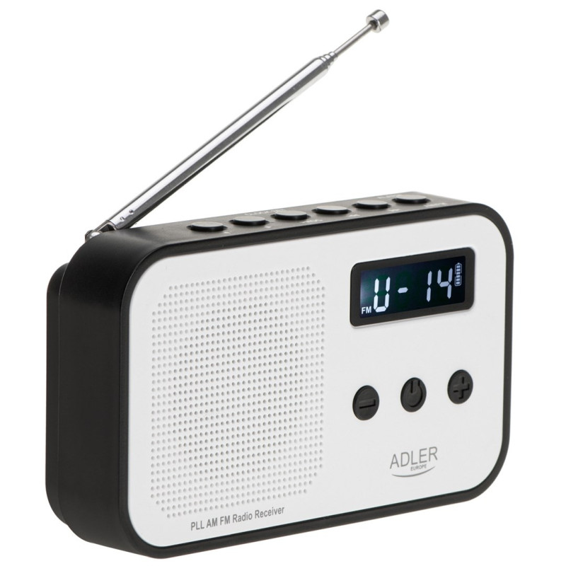 The Adler AD 1907 radio has a digital tuner with FM and AM bands, supporting up to 20 preset stations. It features an LCD display, alarm function and USB-C power supply, as well as a built-in speaker and headphone output.