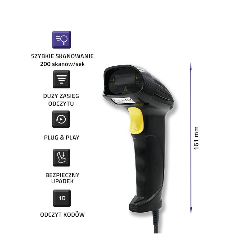 USB wired connection ensures easy setup. Supports 1D barcode scanning with high accuracy.