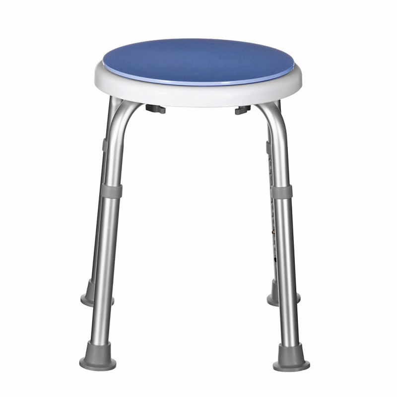 The rotating shower bench has a round shape, adjustable height and non-slip feet for stability. It has four legs and is available in blue, silver and white.