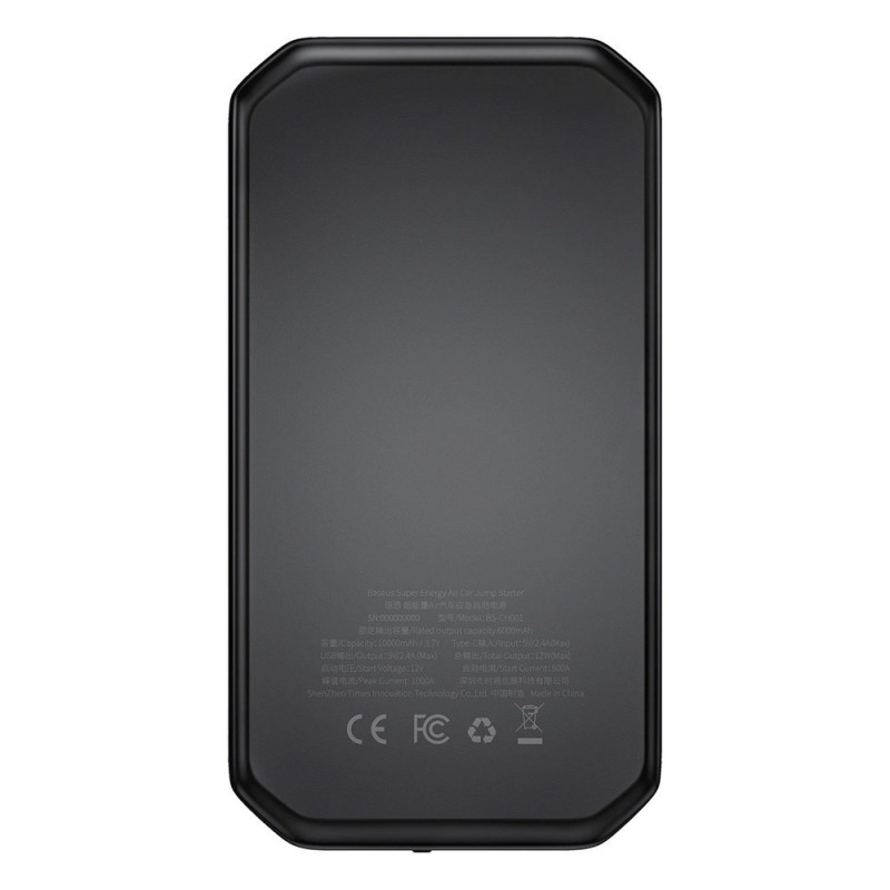 The Baseus BS-CH001 is a 10000 mAh jump starter with 500 A starting current, crocodile clips included. It features a digital display, integrated flashlight, and one USB Type-C and one USB Type A port.