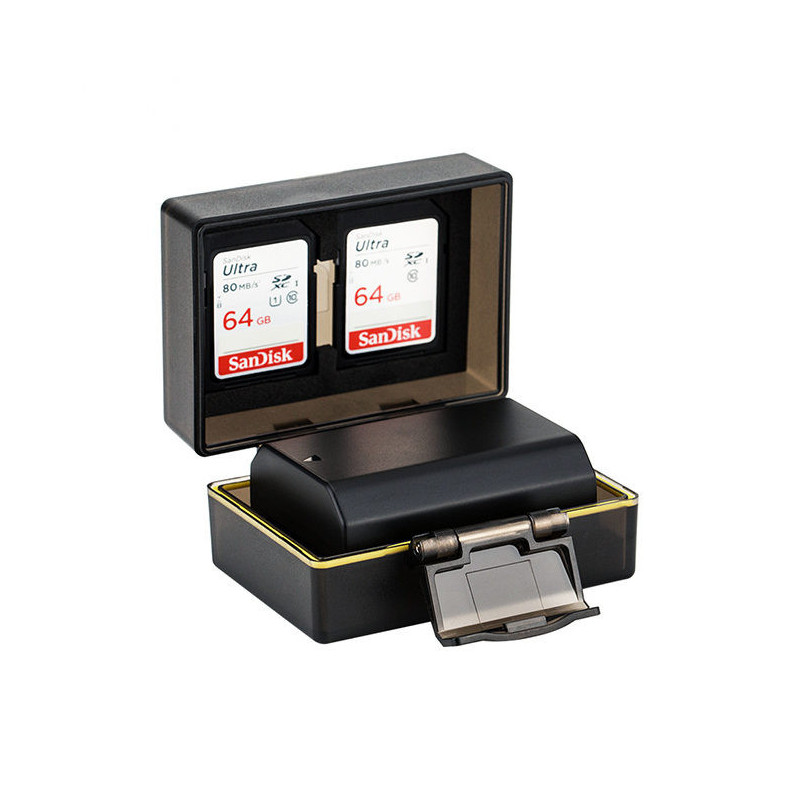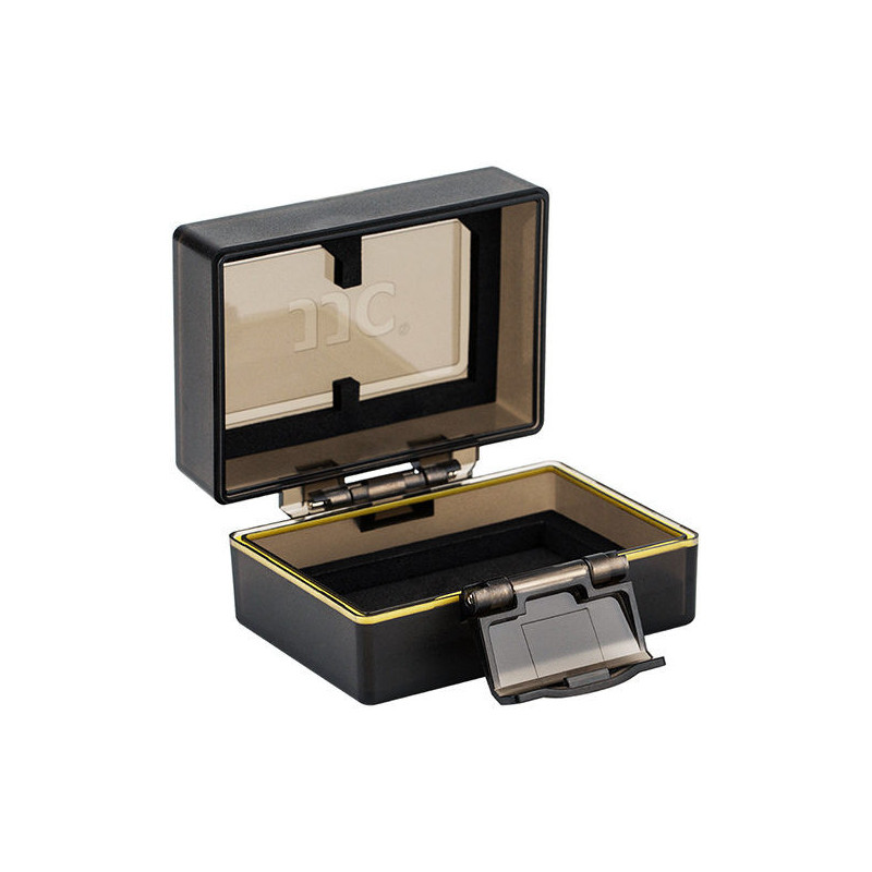 The JJC BC 2NPFZ100 Multi-Function Battery Case provides space for a Sony NP FZ100 battery and two memory cards. It features a waterproof seal and a soft interior to protect against moisture and dirt.