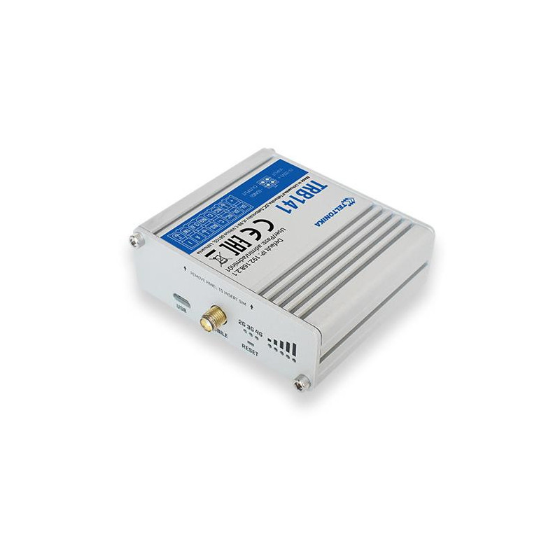 | Summary | Teltonika TRB141. Product colour: Grey, International Protection (IP) code: IP30. Antenna type: External, Antenna connector type: SMA. Processor frequency: 1200 MHz, Internal memory: 128 MB, Flash memory: 512 MB. Management protocols: HTTP/HTTPS, JSON-RPC, RMS, Supported network protocols: TCP, UDP, IPv4, IPv6, ICMP, NTP, DNS, HTTP, HTTPS, SSL v3, TLS, SSH, DHCP, SNMP, MQTT. VPN support: OpenVPN, IPsec, GRE, PPTP, L2TP, NAT functionality: NAT, NAT-T |