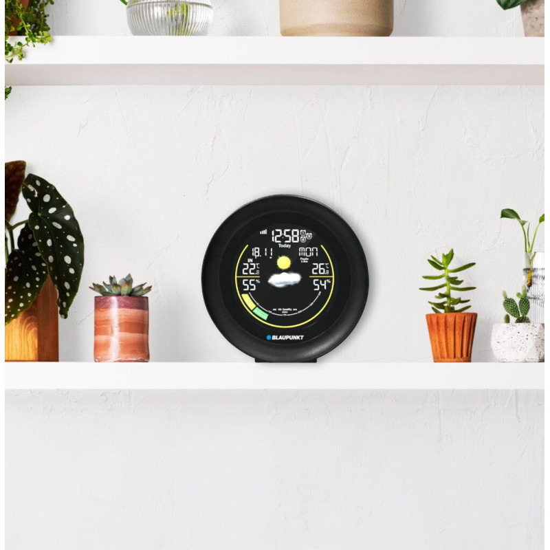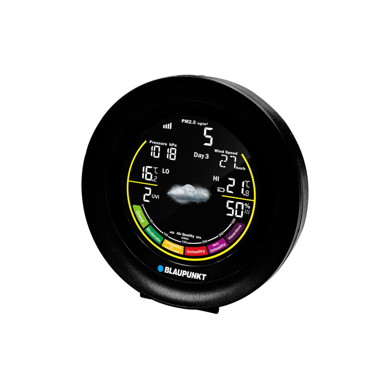 Weather station working with the TUYA SMART application, with a wireless sensor for measuring outdoor temperature and humidity, with a weather forecast for the next 3 days updated on a regular basis via Wi-Fi connection, UV index indicator, clock with calendar and alarm function, as well as a PM2.5 and Air Quality Index reading.