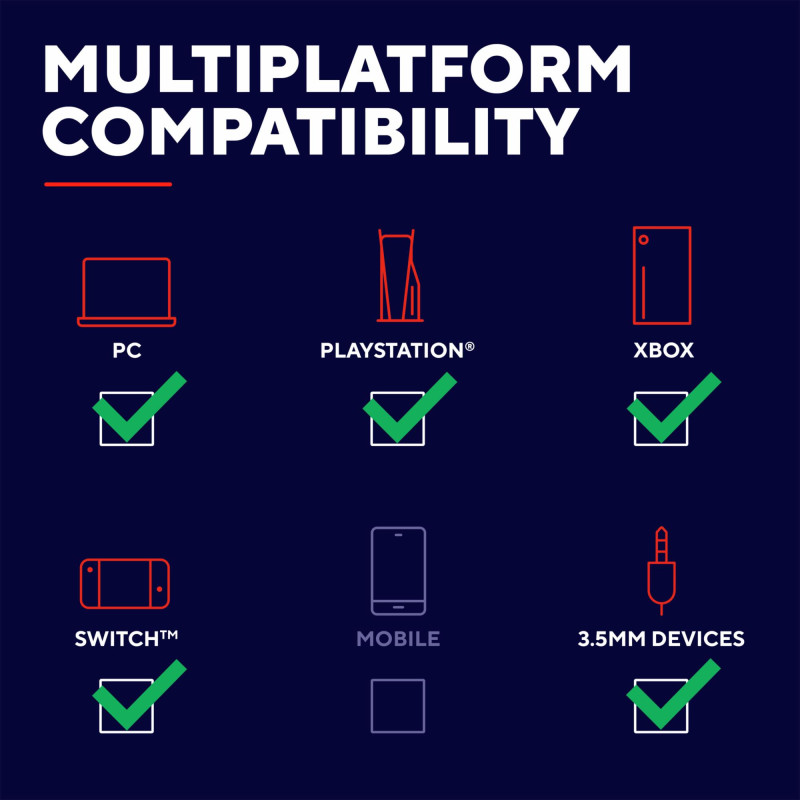 Great sound, for all your platforms. Whether you're a fan of PC, PlayStation, Xbox, Switch or anything else, the Carus Multiplatform Gaming Headset easily connects to any 3.5mm devices via the 1.2m fixed cable or included 1m extension cable.