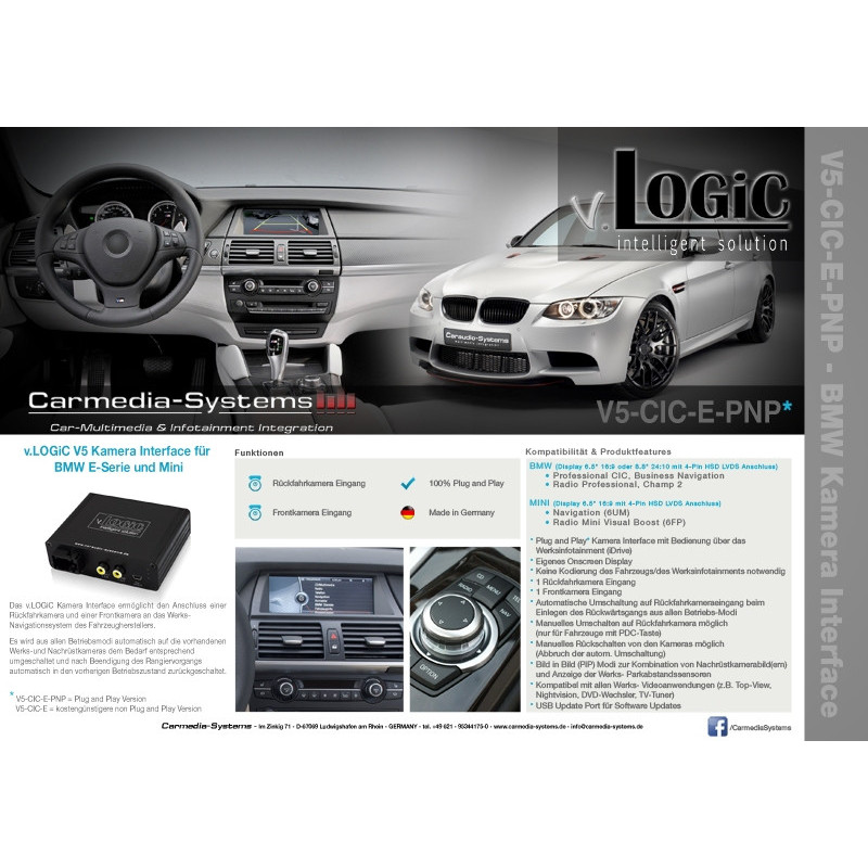 Video Interface for BMW - two connection optionsOur recommended Video Interface for front and rear reversing cameras can be connected in two ways. One is to install it into the car's original radio, and the other is to install it into the Business, Professional Series CIC, or MINI navigation system with IDrive. The interface is compatible with 6- and 8.8-inch displays.