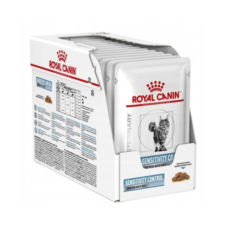 ROYAL CANIN Sensitivity Control Chicken Gravy is a wet cat food formulated for adult cats with food allergies and intolerances. Each pack contains 85g of chicken flavoured food, free of artificial colours, suitable for cats of all breeds.