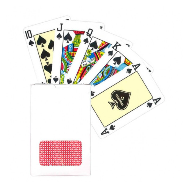 Made from virtually indestructible PVC plastic for years of use. The cards can be quickly wiped clean with a damp cloth, so they won't wear out over time. The decks come with a hard plastic case for storage and transport. Each deck contains 52 cards, 2 Jokers and 1 COPAG card.