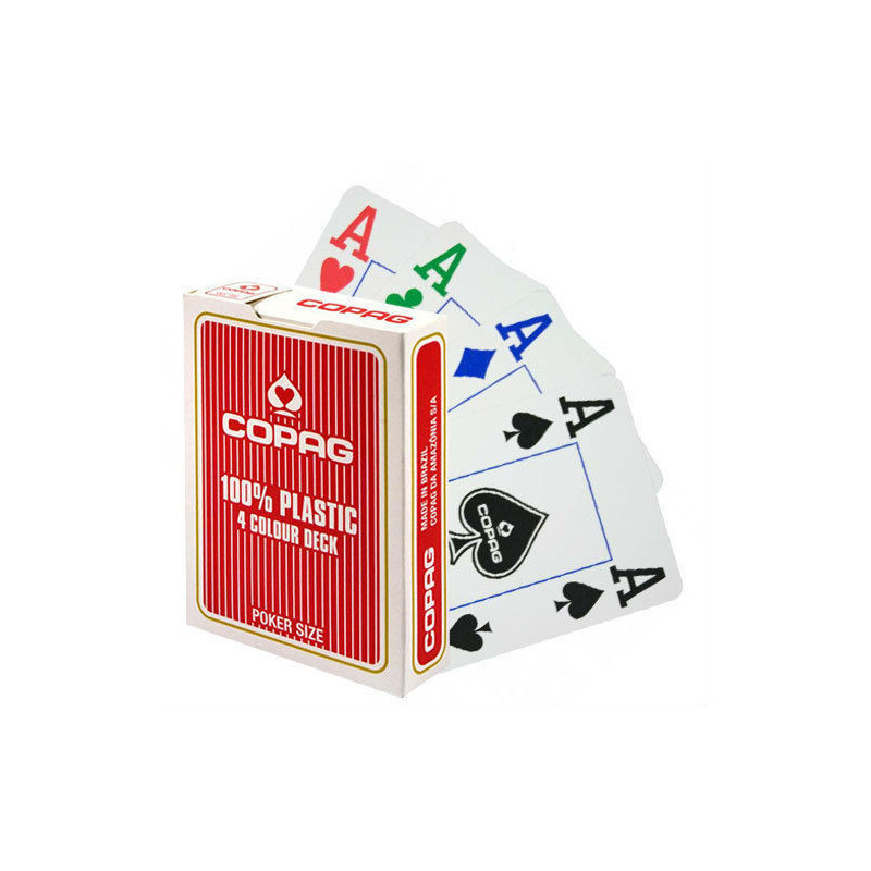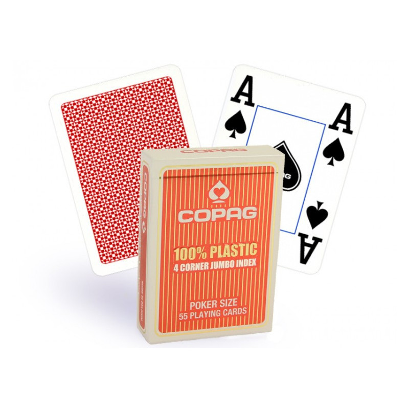 Copag 4 Corner Jumbo Index 100% plastic poker cards. Due to their high quality, the cards are water resistant and last up to 500 times longer than paper cards.