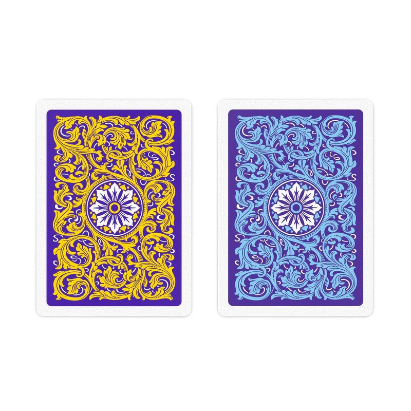 Two decks of poker-sized Copag playing cards with patterned backs in purple, yellow and blue. Made of 100% PVC plastic, these cards are durable and washable, perfect for poker and home games.