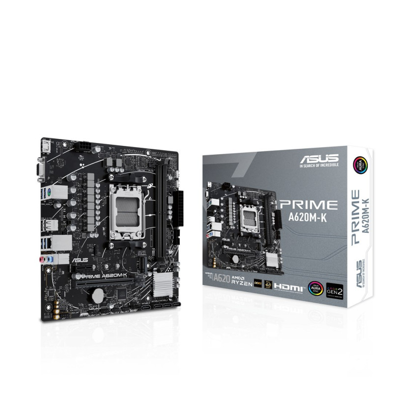 ASUS PRIME A620M-K - micro ATX motherboard supporting AM5 processors and up to 96 GB DDR5 memory, ensuring excellent performance with a variety of I/O connectors.