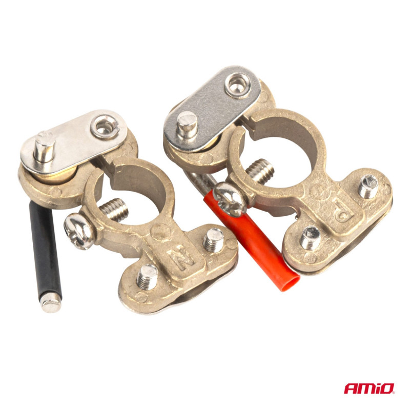 The set includes two clamps: one for the negative terminal and one for the positive terminal. These clamps are standardly installed in most vehicles. Before installing or replacing the clamps, thoroughly clean the battery connector to ensure good contact and proper charging without any losses.