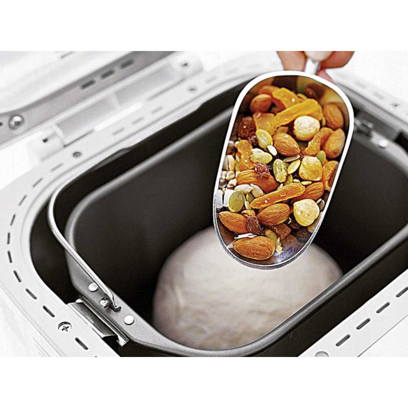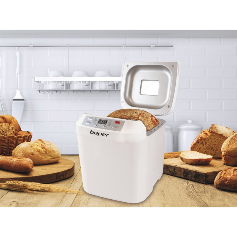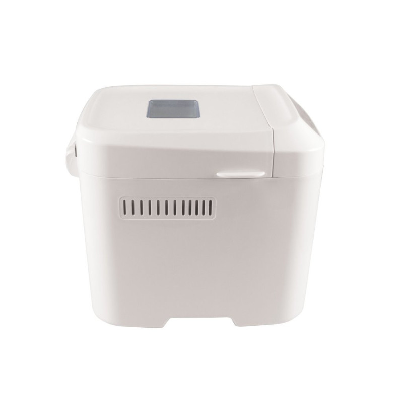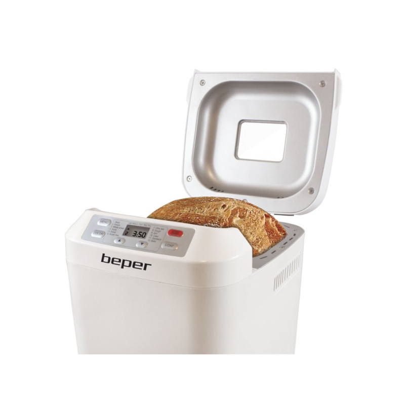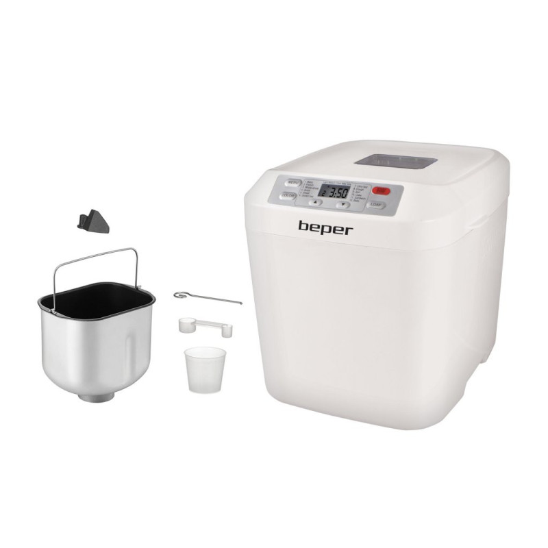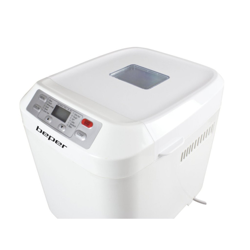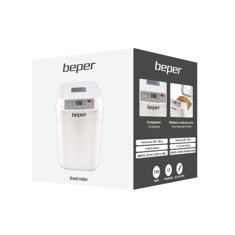 Bread machine with non-stick and washable container and with window to control cooking progress. Maximum capacity 900gr of bread. It kneads, rises and bakes bread. It has 12 selectable programs, keeping warm for an hour and 13 hours adjustable timer. Measuring spoon and graduated cup supplied. Non-slip feet.