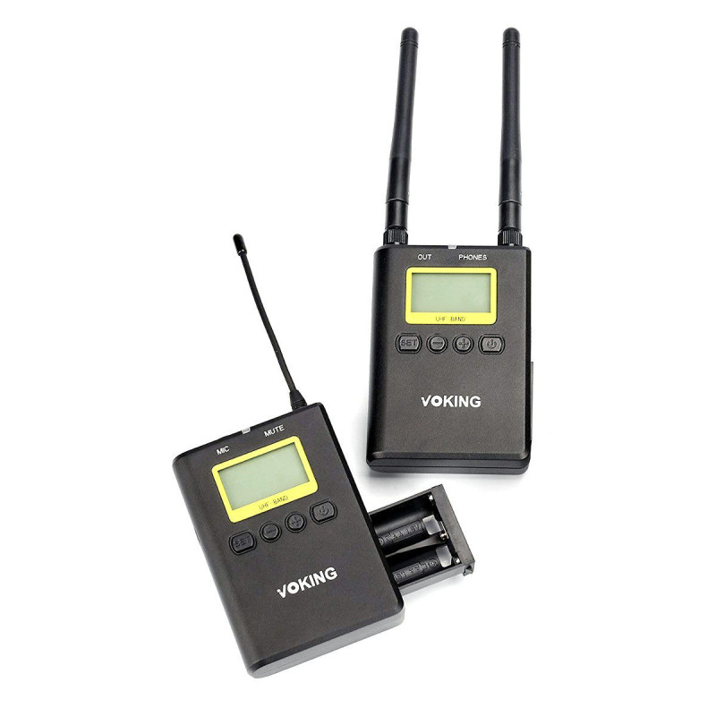 The Meike VK WM210 is a wireless audio system that includes a transmitter, receiver, and lavalier microphone. It offers dual-channel UHF technology with a range of up to 100 meters and has a noise reduction function for clear audio recording.