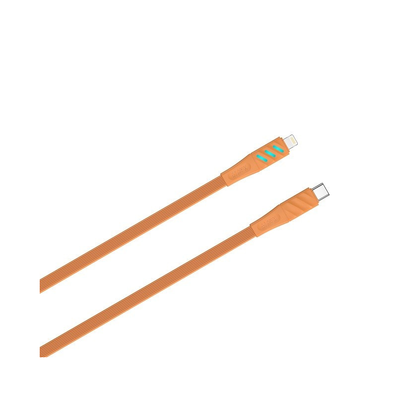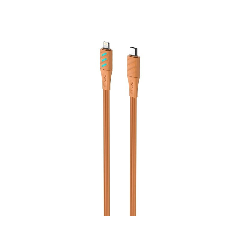The Havit CB6255 is a 1m USB Type-C to Lightning charging cable in orange. It supports Power Delivery and has safety warnings for proper use.