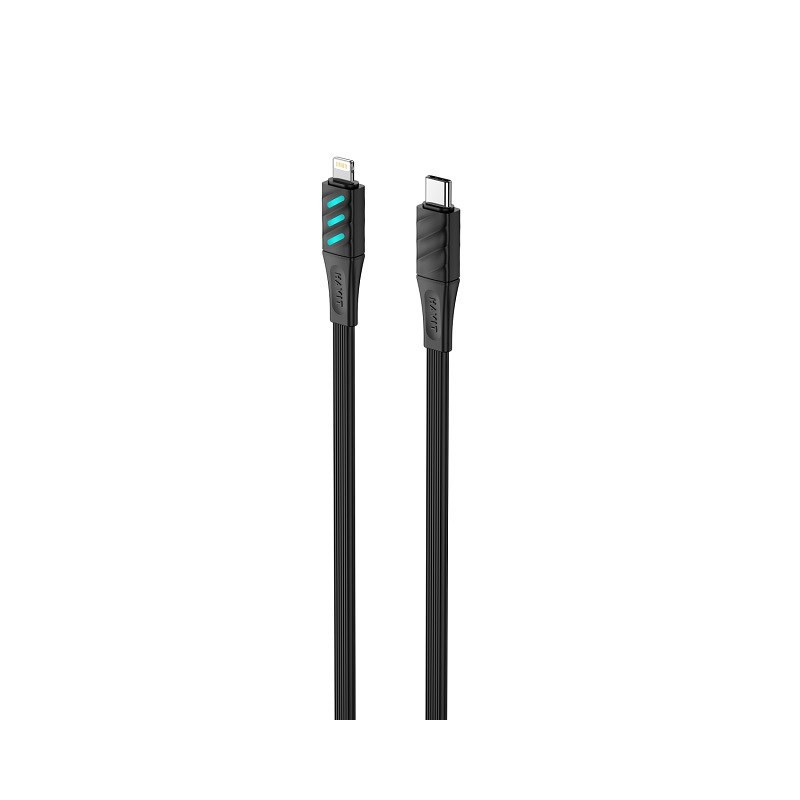 Havit CB6255 is a 1-meter USB-C to Lightning charging cable in black, supporting Power Delivery up to 27 W. The cable is designed for safe use, with warnings about possible damage, exposure to moisture, and excessive bending or twisting.