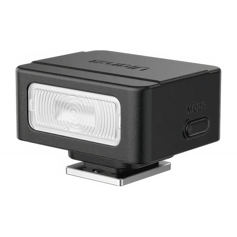 Ultra-compact flash with GN8 guide number, CRI 96 and 6500K color temperature. Offers four brightness levels, a built-in 250 mAh battery that allows for up to 375 flashes, and USB-C charging.