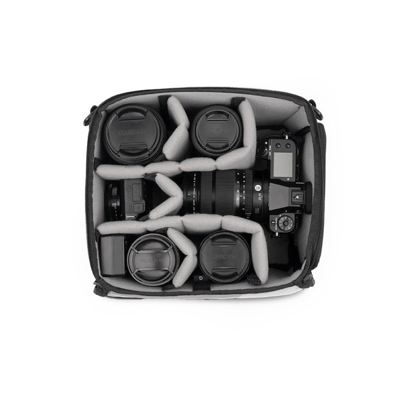 The Essential Deep Camera Cube v2 is a weatherproof storage system for camera equipment, featuring a modular partition system that allows for individual organization. It provides quick access from the side and has elastic holders for smaller accessories, ensuring efficient equipment management.