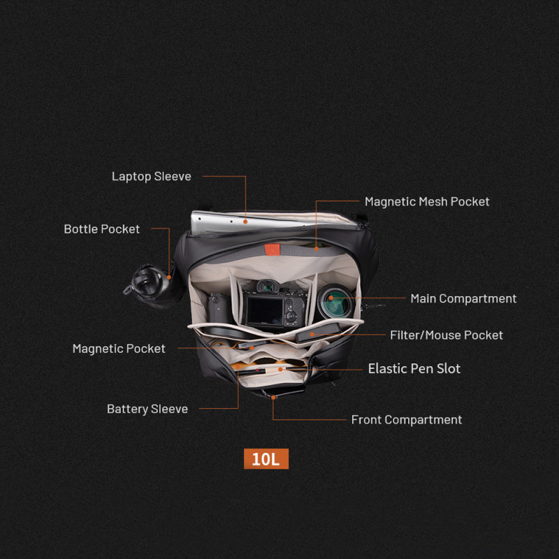 The PGYTECH OneGo Solo V2 10L is a versatile backpack for everyday use and photography, featuring a wide opening, customizable compartments, and multiple pockets for organizing your belongings. The backpack has a separate pocket for a 14" MacBook, a hidden side pocket for a water bottle, and a removable shoulder strap for convenience.