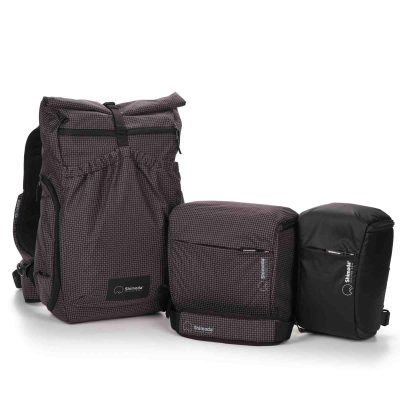 The Shimoda Side Lite 22 Starter Kit is a roller backpack designed for mountain hikers and creators, with a side entry for easy access to gear. The kit includes a medium-sized Top Loader camera insert for soft camera protection, and is made of lightweight, water-resistant material.