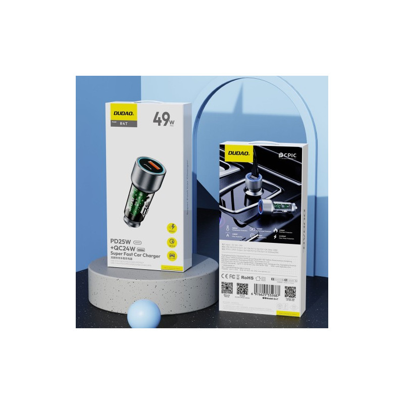 Discover the capabilities of the Dudao R4T 25W car charger, which offers fast charging, support for many popular standards, and versatility thanks to two ports: USB-A and USB-C. No matter what mobile device you have, this charger will ensure you're never without power. With 25W of power, you can charge your device faster than ever before, and the compact, gray design blends seamlessly into any car interior. It's the perfect solution for those who value speed, convenience, and versatility all in one.
