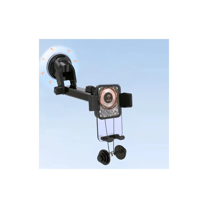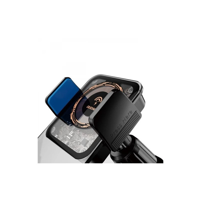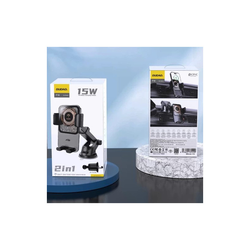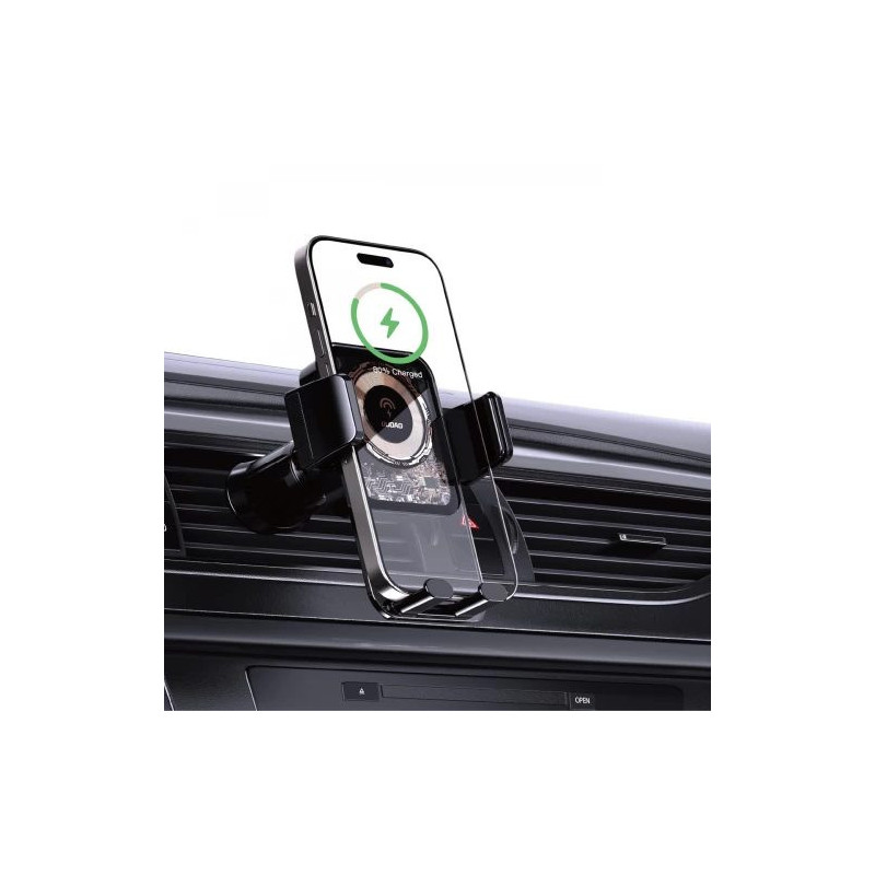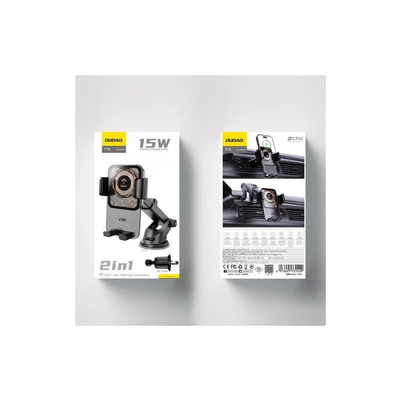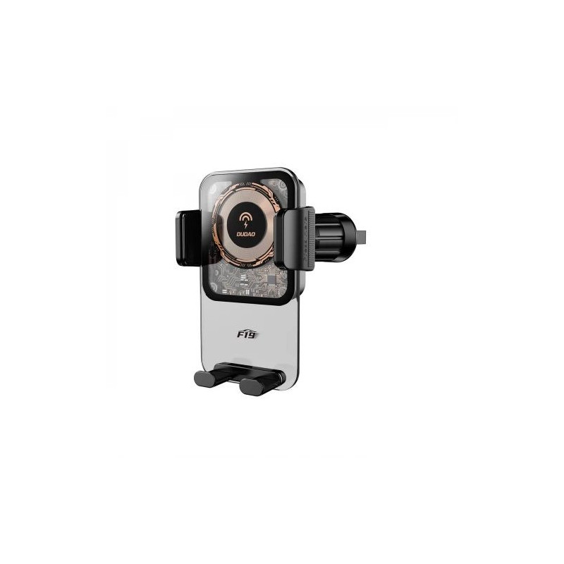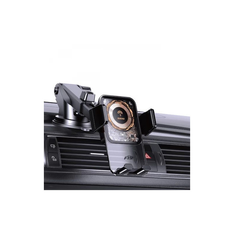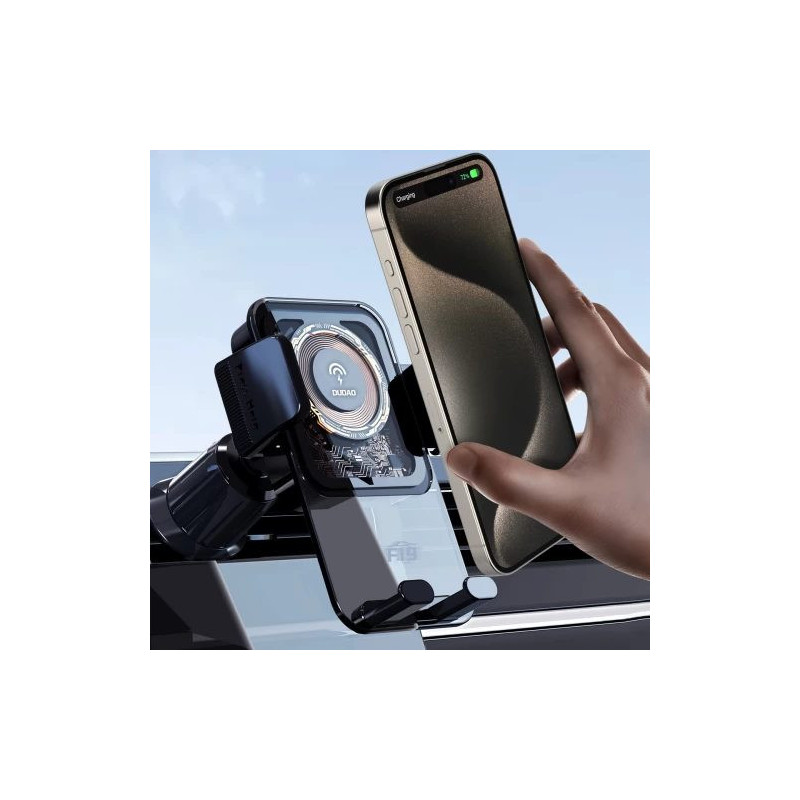 The Dudao F19 is a functional, manual car holder with a built-in 15W inductive charger, designed for drivers who value convenience and modern solutions. You place your phone in the holder's arms and manually clamp them, while a release button on the back makes one-handed operation easy. A stable clamping mechanism with soft silicone pads ensures a secure hold, even on bumps. The futuristic design and the ability to mount both on the air vent and dashboard allow you to customize the holder to your car's interior. A 1-meter USB-A to USB-C cable is included, so you can immediately connect the charger to a power source.