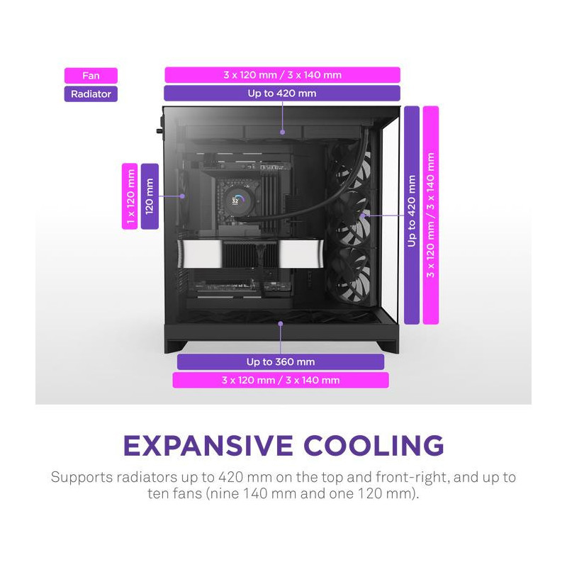 Holds up to 420 mm radiators on the top and front-right panels for versatile cooling.