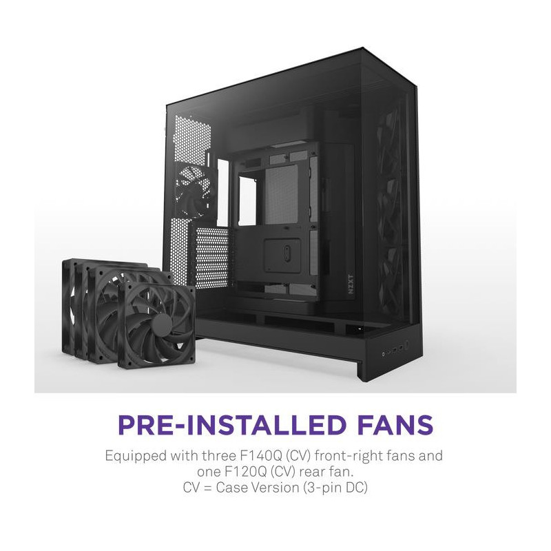 | Summary | NZXT H9 Flow. Form factor: Midi Tower, Type: PC, Product colour: Black. Front fans installed: 3x 140 mm, Front fans diameters supported: 120,140 mm, Rear fans installed: 1x 120 mm. Supported HDD sizes: 2.5,3.5". Width: 315 mm, Depth: 481 mm, Height: 506 mm |